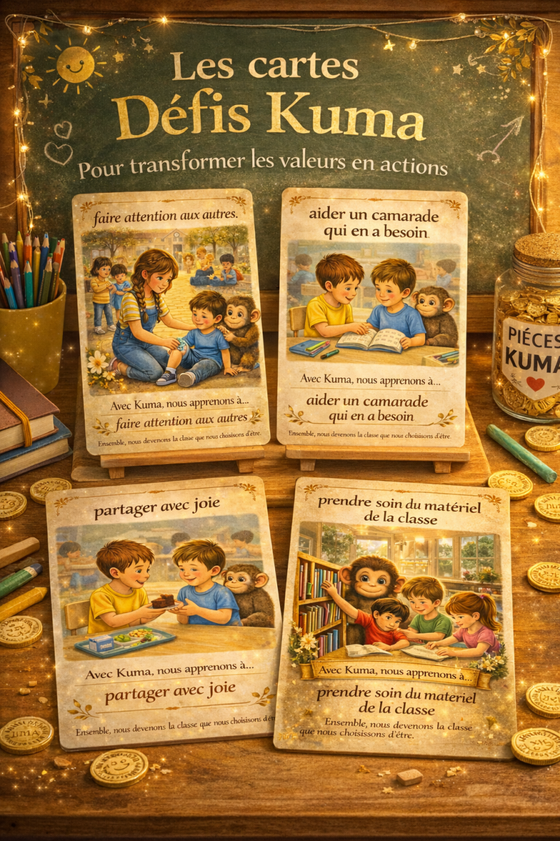 Chaque carte invite les enfants à relever un petit défi du quotidien : aider un camarade, écouter avec attention, encourager, partager ou poser un geste de gentillesse.